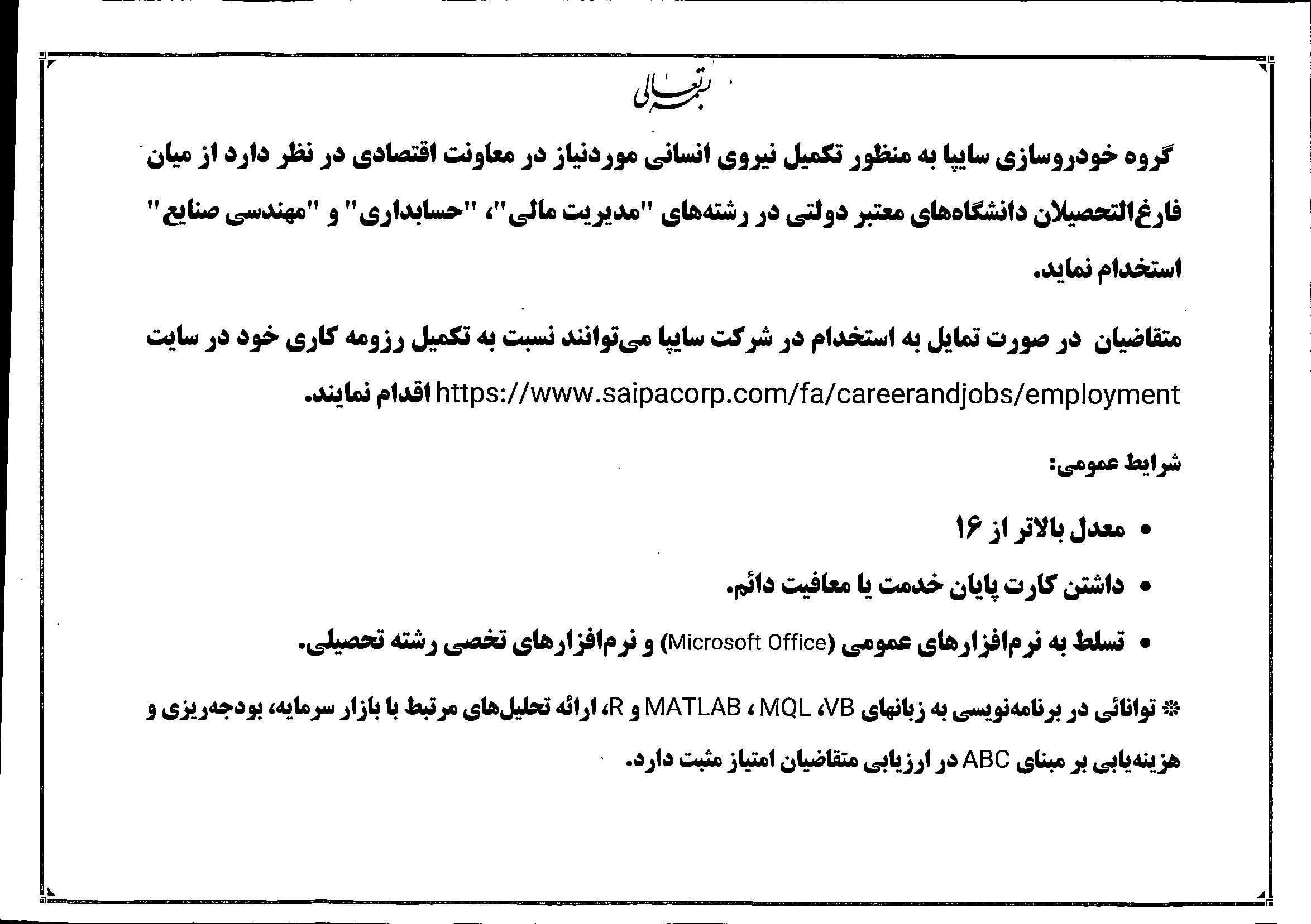 گروه خودروسازی سایپا به منظور تکمیل نیروی انسانی موردنیاز خود در نظر دارد از بین فارغ التحصیلان در رشته های مدیریت مالی و حسابداری استخدام نماید برای اطلاعات بیشتر فایل پیوست را مطالعه بفرمایید