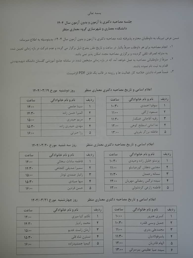 جلسه مصاحبه دكتري با آزمون و بدون آزمون سال ١٤٠٤ دانشکده معماری و شهرسازی گروه معماری منظر