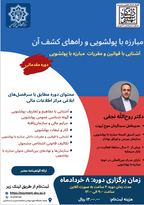 در صورتی که تمایل دارید در دوره مبارزه با پولشویی و راه‌های کشف آن که در دانشگاه شهید بهشتی به صورت آنلاین برگزار می‌شود شرکت کنید لطفا از طریق زیر اقدام فرمایید.