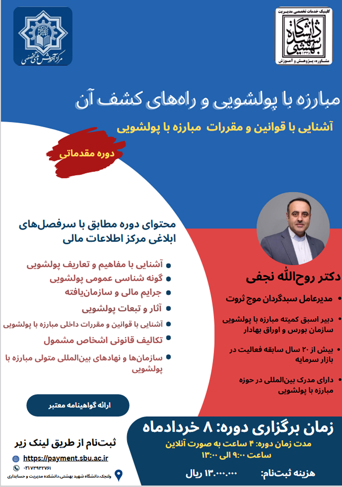 در صورتی که تمایل دارید در دوره مبارزه با پولشویی و راههای کشف آن که در دانشگاه شهید بهشتی به صورت آنلاین برگزار میشود شرکت کنید لطفا از طریق زیر اقدام فرمایید.