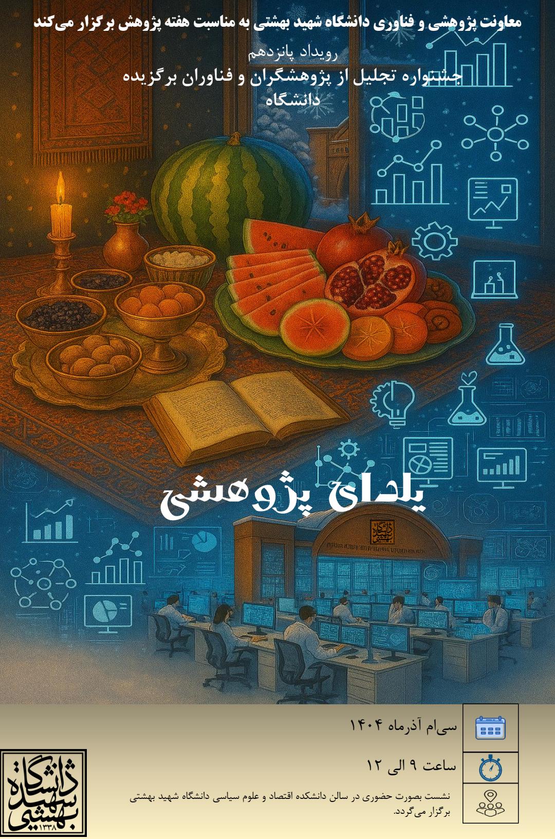 به مناسبت گرامیداشت هفته پژوهش و فناوری، معاونت پژوهشی و فناوری دانشگاه شهید بهشتی رویداد «یلدای پژوهشی» را با هدف تقدیر از برترین پژوهشگران و فناوران دانشگاه برگزار میکند.
