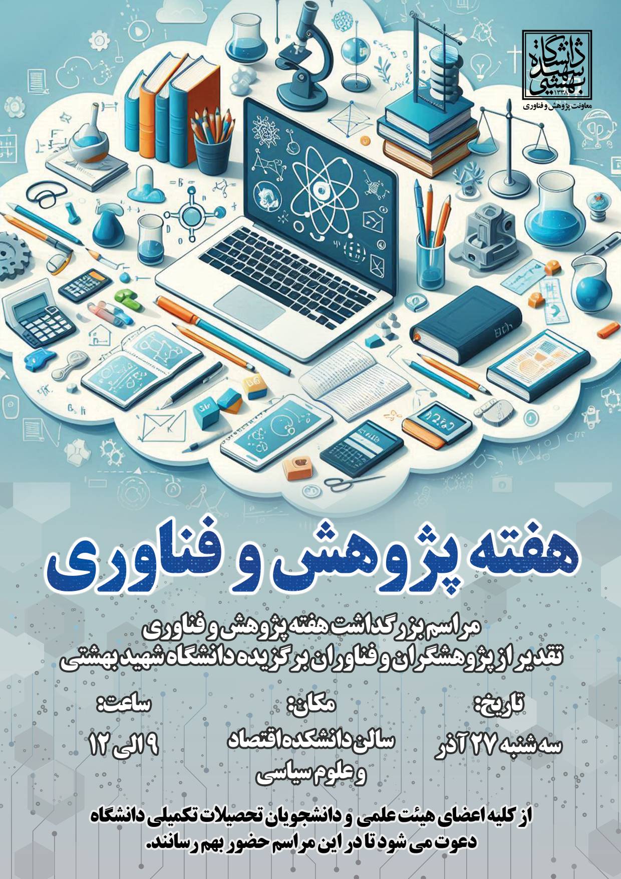 معاونت پژوهشی و فناوری دانشگاه شهید بهشتی به‌مناسبت «هفته پژوهش» مجموعه‌ای از برنامه‌ها و کارگاه‌های تخصصی را برگزار می‌کند. خانم دکتر حمیدی، معاون محترم پژوهشی دانشگاه، اعلام کرد که امسال هفته پژوهش از ابتدای آذر ماه آغاز شده و برنامه‌های متنوعی برای اعضای هیأت علمی و دانشجویان تحصیلات تکمیلی در نظر گرفته شده است. این برنامه‌ها به‌گونه‌ای طراحی شده‌اند که بتوانند نیازها و علاقه‌مندی‌های مختلف جامعه دانشگاهی را پاسخگو باشند. از جمله برنامه‌های این هفته می‌توان به نشست‌های صمیمی معاون پژوهشی با دانشجویان و اعضای هیأت علمی اشاره کرد. این نشست‌ها فرصتی مناسب برای تبادل نظر و بحث درباره چالش‌ها و فرصت‌های موجود در حوزه پژوهش و فناوری به شمار می‌روند. همچنین، روز باز پژوهشی برای دانش‌آموزان نیز به‌عنوان یکی از جذاب‌ترین بخش‌های این هفته در نظر گرفته شده است، که به آنها این امکان را می‌دهد تا با فضای پژوهشی دانشگاه آشنا شوند و با فعالیت‌های محققان جوان و اعضای هیأت علمی ارتباط برقرار کنند.