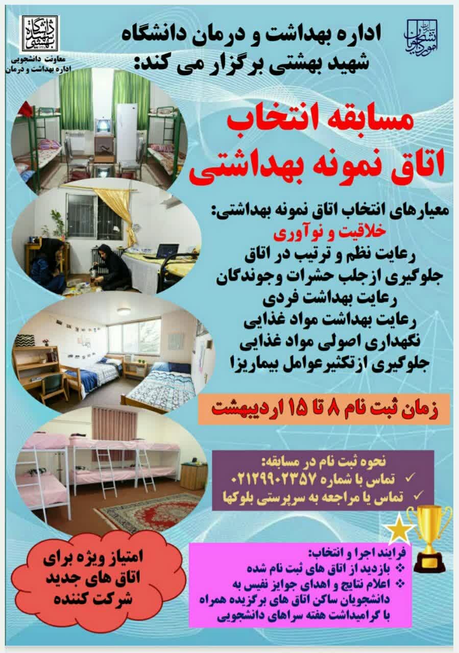مسابقه ی انتخاب اتاق نمونه ی دانشجویی با هدف ایجاد انگیزه و نشاط در سراهای دانشجویی و اشاعه فرهنگ زندگی جمعی سالم و حفظ سلامت و بهداشت به صورت سراسری با نظارت دفتر مشاوره ی سلامت و سبک زندگی سازمان امور دانشجویان و توسط اداره بهداشت و درمان برگزار می گردد. علاقمندان می توانند از تاریخ 8 لغایت 15 اردیبهشت ماه 1403 از طریق تماس با شماره ی 29902357 و یا مراجعه به سرپرستی امور خوابگاهها در این مسابقه ثبت نام نمایند .