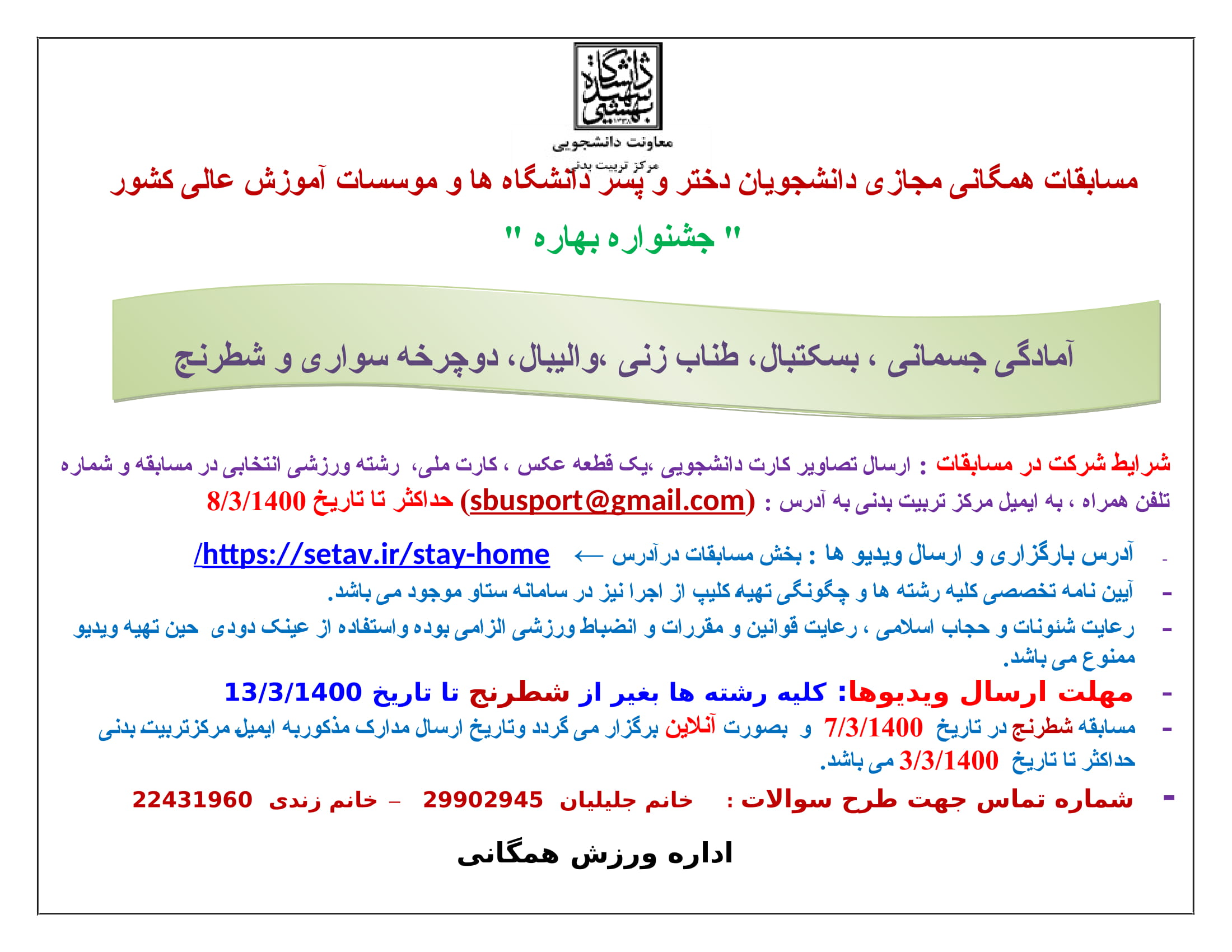 مسابقات همگانی مجازی دانشجویان دختر و پسر دانشگاه ها و موسسات آموزش عالی کشور (جشنواره بهاره) در رشته های آمادگی جسمانی، بسکتبال، طناب زنی، والیبال، دوچرخه سواری و شطرنج برگزار میگردد.