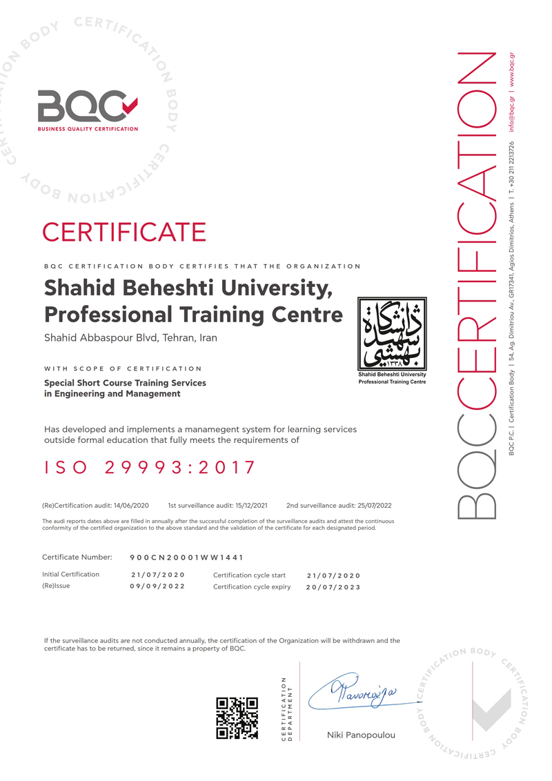 در اين خصوص تحت موازین، الزامات ویژه چهار محور استاندارد متذکره، و بر اساس خط مشی نظام مديريت يكپارچه هر ساله نسبت به برگزاری جلسات بررسی مميزی و تمديد اعتبار، از موسسه اعتباردهنده (ESYD) و گواهی‌دهنده BQC (مستقر در اتحاديه اروپا) پیرو فعالیت‌هایی مستمرکیفی، و اثرگذار را در قالب اصلاح و بهبود روش‌های اجرایی و سامانه‌های نرم‌افزاری را معمول نموده است.