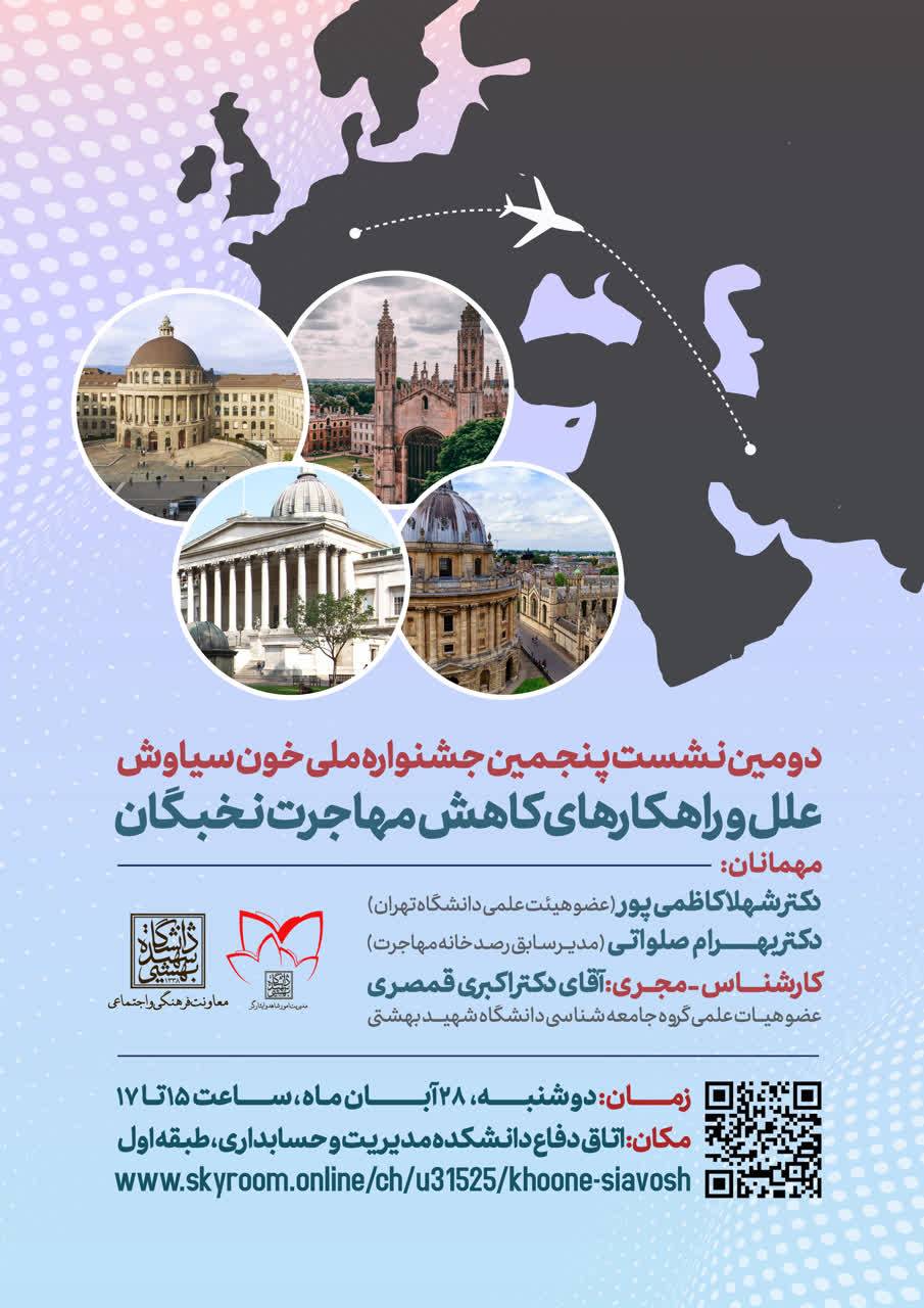 دومین نشست از سلسله نشست‌های پنجمین جشنواره خون سیاوش با موضوع مهاجرت؛ «بازگشت»، در روز دوشنبه مورخ 28 آبان ماه با حضور اساتید و کارشناسان، با موضوع مهاجرت نخبگان، علل و راهکارهای کاهش آن، به صورت حضوری و برخط برگزار شد. در این نشست ضمن پرداختن به وضعیت کنونی مهاجرت نخبگان، علل این مسأله و راهکارهای مدیریت آن بیان شد.